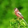 红腰朱雀:体长12-14厘米,小型鸟类。雄鸟前额和眉纹玫瑰粉红色,头顶和一宽的贯眼带深红褐色,背红棕褐色具暗褐色纵纹,腰玫瑰粉红色,两翅和尾暗褐色,羽缘色淡颊、头侧、颏、喉和其余下体玫瑰粉红色。雌鸟…全部>>