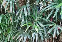 矮棕竹:丛生灌木,高1米或更高些,茎圆柱形,有节,上部被紧密的网状纤维的叶鞘,纤维毛发状,淡褐色。叶掌状深裂,裂片7-20片,线形,具1-2条肋脉,叶柄约与叶片等长,较细,两面凸起,边缘平滑。花雌雄…全部>>