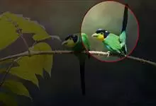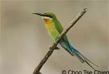 蓝喉蜂是蜂虎科蜂虎属鸟类。体长26-28厘米,嘴长而弯曲,有明显细长的中央尾羽。头部、颈部和背部为巧克力色,有黑色眼纹。喉部、腰部和尾羽为蓝色。腹部和两翼为绿色。幼鸟外观似成鸟,头部、颈部和背部为绿色,…全部>>
