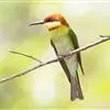 栗喉蜂虎是蜂虎科蜂虎属的鸟类。有热带鸟类羽毛艳丽的特征:喉部是栗红色的,黑色的过眼纹,翅膀和背部是绿色的,尾翼是蓝色的,飞行时翅膀下面的羽毛是橙黄色的,在阳光的照射下,它们全身闪烁着金属般的艳丽光泽,…全部>>