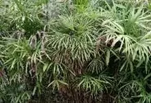 矮棕竹:丛生灌木,高1米或更高些,茎圆柱形,有节,上部被紧密的网状纤维的叶鞘,纤维毛发状,淡褐色。叶掌状深裂,裂片7-20片,线形,具1-2条肋脉,叶柄约与叶片等长,较细,两面凸起,边缘平滑。花雌雄…全部>>