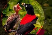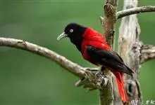 朱鹂:中等鸟类,体长23-28厘米。雄鸟绛紫红色,头、上胸及翼黑色。雌鸟上背及背部深灰色,尾覆羽及尾绛紫红色,腹部及下胸白而密布黑色纵纹。与鹊色鹂幼鸟的区别在上背灰色较深,下体白色较少且纵纹较粗。…全部>>