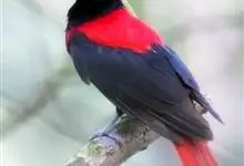 朱鹂:中等鸟类,体长23-28厘米。雄鸟绛紫红色,头、上胸及翼黑色。雌鸟上背及背部深灰色,尾覆羽及尾绛紫红色,腹部及下胸白而密布黑色纵纹。与鹊色鹂幼鸟的区别在上背灰色较深,下体白色较少且纵纹较粗。…全部>>