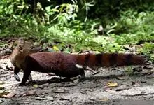 浣熊:食肉目、浣熊科的一种哺乳动物,成年体长40-65厘米,尾长20-40厘米,体重4-10千克,雄性稍大于雌性。体型较小。面部有黑色眼斑,形象滑稽,绰号“蒙面大盗”;尾部有5到7条黑白相间的环纹。…全部>>