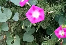 五爪金龙 Sweet),旋花科番薯属多年生缠绕草本植物。茎细长,有细棱;叶片为掌状;花冠紫红色、紫色或淡红色、偶有白色,漏斗状;蒴果近球形。花期5~12月。五爪金龙的叶子类似掌状,有5至7个裂痕,…全部>>