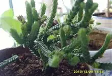 筒叶花月,是景天科青锁龙属的多年生草本植物。植株多分株,灌木状,茎较粗壮,圆柱形,表皮灰褐色;叶片肉质,互生,呈圆筒状,簇生于茎或分枝顶端,叶端呈斜截形,截面为椭圆形;花呈星状,淡白色;花期秋季。…全部>>