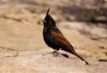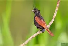 凤头鹀:属小型鸣禽,体重21-31克,体长134-175毫米。以头顶的细长羽冠为特征,雄鸟全身几乎均为黑色具蓝色光泽,两翅和尾以及尾上覆羽栗红色。雌鸟具短的褐色羽冠,上体暗橄榄褐色,…全部>>