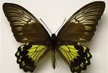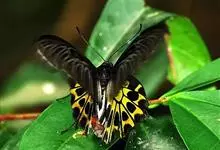 金裳凤蝶是凤蝶科、裳凤蝶属的动物。金裳凤蝶身体呈黑色,头、颈和胸侧有红毛,腹部有黑黄两色相间条纹,雄蝶前翅黑色,具黑天鹅绒光泽,各脉两侧灰白色,后翅金黄色,各室外缘有等腰三角形黑斑1枚,斑内侧有晕,…全部>>