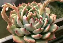 吉娃莲,景天科拟石莲花属,别名:吉娃娃,吉娃莲,植株小型,无茎的莲座叶盘非常紧凑。卵形叶较厚,带小尖,蓝绿色被浓厚的白粉,叶缘为美丽的深粉红色。花序先端弯曲,钟状,红色。栽培不太困难,…全部>>