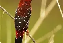 红梅花雀小型鸟类,体长9-10厘米。雄鸟通体朱红色,背、肩、胸等满布白色小斑点,两翅和尾黑褐色均具白色端斑,嘴红色,脚蜡黄色。雌鸟上体淡褐色或赭褐色,翅上中覆羽、大覆羽和内侧飞羽末端具白色斑点,…全部>>