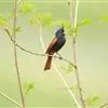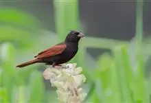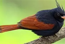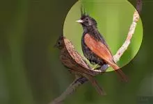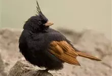 凤头鹀:属小型鸣禽,体重21-31克,体长134-175毫米。以头顶的细长羽冠为特征,雄鸟全身几乎均为黑色具蓝色光泽,两翅和尾以及尾上覆羽栗红色。雌鸟具短的褐色羽冠,上体暗橄榄褐色,…全部>>