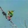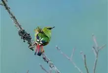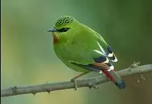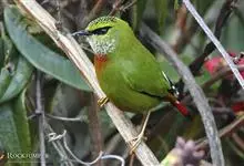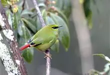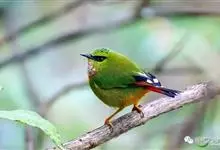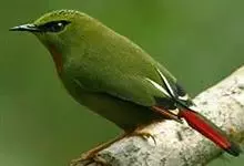 火尾绿鹛是莺科、绿鹛属小型鸟类,体长11-14厘米。上体绿色,头顶至枕具黑色鳞状斑,眼先和眼后黑色,眉纹黄绿色。两翅黑色具黄色和红色翅斑及白色端斑,极为醒目。中央一对尾羽绿色,外侧尾羽鲜红色。…全部>>