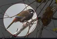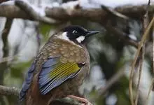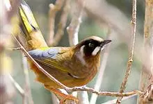 黑顶噪鹛:中型鸟类,体长24-26厘米。前额、脸、颏、喉黑色,头顶黑褐沾棕或深棕橄榄褐色,背栗褐或棕褐色,颧斑白色或棕红色,眼后缘和颈侧亦具白斑,飞羽金黄橄榄色而具蓝灰色尖端。下体淡棕褐色。…全部>>