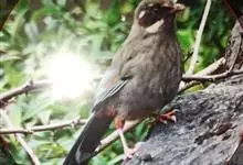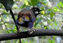 灰腹噪鹛是画眉科、噪鹛属鸟类。中型鸟类,体长21-25厘米。额黑色,头顶黑或灰色,眼先、脸白色。上体橄榄褐至棕褐色,尾和内侧飞羽具窄的白色端斑和宽阔的黑色亚端斑,外侧初级飞羽外翈蓝灰色或灰色,颧纹黑色。…全部>>