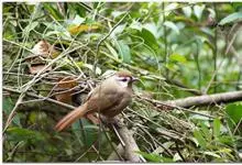 白颊噪鹛是雀形目噪鹛科噪鹛属鸟类,又称土画眉、小画眉、小噪鹃。成鸟额至头顶栗褐色,长眉纹、眼先和颊纹棕白色,眼后至耳羽深褐色,…全部>>