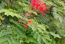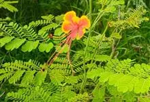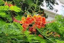 洋金凤 Sw.),豆科小凤花属灌木状或小乔木植物,枝无毛,绿或粉绿色;二回羽状复叶;总状花序伞房状,萼片无毛,花瓣橙红或黄色,圆形,花丝红色,子房无毛,花柱橙黄色;荚果窄而薄,…全部>>