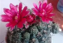 绯花玉 Speg.)是仙人掌科、裸萼球属多肉植物,植株呈扁球形,表皮墨绿色,刺针状,每个刺座有5枚灰色周刺,花生于球体顶端,夏季开花,花色有白、粉红、深红等。果实纺锤形,深灰绿色,种子黑色。…全部>>