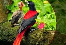 朱鹂:中等鸟类,体长23-28厘米。雄鸟绛紫红色,头、上胸及翼黑色。雌鸟上背及背部深灰色,尾覆羽及尾绛紫红色,腹部及下胸白而密布黑色纵纹。与鹊色鹂幼鸟的区别在上背灰色较深,下体白色较少且纵纹较粗。…全部>>
