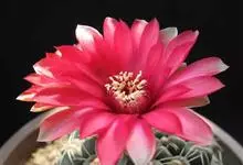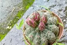 绯花玉 Speg.)是仙人掌科、裸萼球属多肉植物,植株呈扁球形,表皮墨绿色,刺针状,每个刺座有5枚灰色周刺,花生于球体顶端,夏季开花,花色有白、粉红、深红等。果实纺锤形,深灰绿色,种子黑色。…全部>>