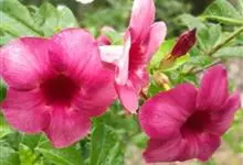 紫蝉花是夹竹桃科黄蝉属植物;其常绿蔓性灌木;叶片轮生,长椭圆形或倒卵状披针形;花腋生,漏斗形,呈暗桃红色或淡紫红色;花期为春夏季。紫蝉花原产于巴西,在中国云南、海南和广东栽培较多;喜高温,不耐寒,…全部>>
