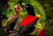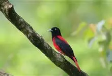 朱鹂:中等鸟类,体长23-28厘米。雄鸟绛紫红色,头、上胸及翼黑色。雌鸟上背及背部深灰色,尾覆羽及尾绛紫红色,腹部及下胸白而密布黑色纵纹。与鹊色鹂幼鸟的区别在上背灰色较深,下体白色较少且纵纹较粗。…全部>>