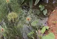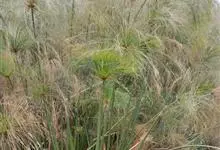 纸莎草是莎草科、莎草属的植物,具有粗壮的根状茎,高达2-3米,茎秆簇生,粗壮,直立,钝三棱形。叶退化呈鞘状,茎秆顶端着生总苞片,呈伞状簇生,总苞片叶状,披针形,顶生花序伞梗极多,细长下垂。瘦果灰褐色,…全部>>