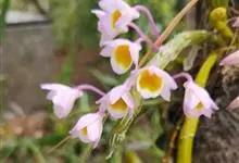 玫瑰石斛是兰科石斛属的多年生附生草本植物。茎斜下或下垂,青绿色,圆柱形,节间鞘具绿或白色相间的条纹;叶窄披针形;花序短,生于已落叶的老茎上部,花序梗长,萼片和花瓣白色,上部带淡紫色,干后蜡质状,…全部>>