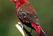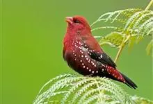 红梅花雀小型鸟类,体长9-10厘米。雄鸟通体朱红色,背、肩、胸等满布白色小斑点,两翅和尾黑褐色均具白色端斑,嘴红色,脚蜡黄色。雌鸟上体淡褐色或赭褐色,翅上中覆羽、大覆羽和内侧飞羽末端具白色斑点,…全部>>