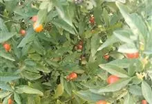 珊瑚樱是茄科茄属植物。株高达2米;植株无毛;叶窄长圆形或披针形,长1-6厘米,基部窄楔形下延,全缘或波状,侧脉4-7对;叶柄长2-5毫米;花单生,稀双生或成短总状花序与叶对生或腋外生,…全部>>