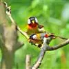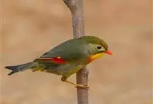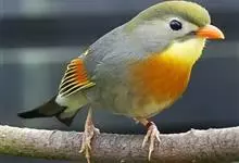 银耳相思鸟小型鸟类,体长14~18厘米。头顶黑色,耳羽银灰色,前额橙黄色;外侧飞羽橙黄色,基部朱红色,极为鲜艳、醒目。尾圆形,尾上、尾下覆羽朱红色,尾暗灰褐色,外侧尾羽橙黄色,其余上体橄榄绿或橄榄黄色。…全部>>