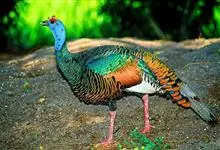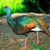 眼斑吐绶鸡:是火鸡科的两种鸟类之一。体型比普通火鸡略小些,体长1米左右,体重2.4-5.4千克,雄性比雌性略大,长得很特别,蓝色的秃脑袋上冒出几个橙黄色的疙瘩。但是它羽色艳丽,身体呈铜色及绿色。…全部>>