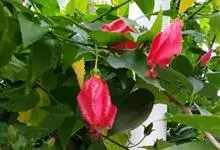 红萼苘麻是锦葵科、苘麻属常绿软木质灌木,叶绿色,长5-10厘米,心形,叶端尖,叶缘有钝锯齿,有时分裂,有细细的叶柄;叶互生,掌状叶脉;花单生于叶腋,具长梗,下垂;花萼红色,半套着大约4厘米长的花瓣,…全部>>