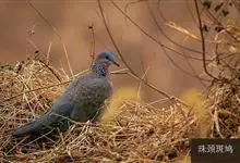 珠颈斑鸠,别名花斑鸠、珍珠鸠、花脖斑鸠、鸪鹪,是鸠鸽科副斑鸠属鸟类。体型中等,体长27~34cm,体重120~205g,雌鸟和雄鸟羽色相似,但雌鸟不如雄鸟羽色亮泽。珠颈斑鸠前额至头顶羽色稍淡,…全部>>