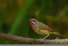 红点颏:是鸟纲、鹟科的鸣禽。又名西伯利亚歌鸲。体长14-17厘米,体重16-27克。雄鸟头部、上体主要为橄榄褐色。眉纹白色。颏部、喉部红色,周围有黑色狭纹。胸部灰色,腹部白色。雌鸟颏部、喉部不呈赤红色,…全部>>