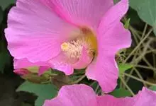 木芙蓉,锦葵科木槿属落叶灌木或小乔木。小枝上有细绒毛;叶片为卵状心形,托叶为披针形,常早落;花单生,花萼为钟形,花冠初为白色或淡红色,后逐渐变为深红色;果实为扁球形,有淡黄色的毛附着。花期8到10月。…全部>>