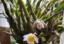 玫瑰石斛是兰科石斛属的多年生附生草本植物。茎斜下或下垂,青绿色,圆柱形,节间鞘具绿或白色相间的条纹;叶窄披针形;花序短,生于已落叶的老茎上部,花序梗长,萼片和花瓣白色,上部带淡紫色,干后蜡质状,…全部>>