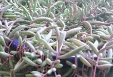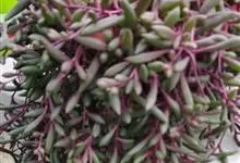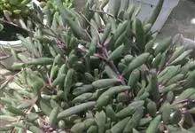 紫玄月是菊科厚敦菊属多年生肉质草本植物。蔓长30-60厘米;茎紫色;叶对生或互生茎上肉质,叶片细圆柱形,中间粗两端细稍弯曲;花序着生于叶腋,头状花序,舌状花黄色,管状花黄色;花期全年。…全部>>