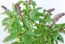 罗勒是唇形科罗勒属一年生草本植物,茎叶花一般有毛;茎钝四棱形,直立多分枝,绿色常染红色;叶卵圆形至卵圆状长圆形,边缘具不规则牙齿;总状花序顶生于茎、枝上,花萼钟形,有刺尖头和长缘毛,花冠二唇形,…全部>>