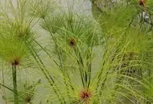 纸莎草是莎草科、莎草属的植物,具有粗壮的根状茎,高达2-3米,茎秆簇生,粗壮,直立,钝三棱形。叶退化呈鞘状,茎秆顶端着生总苞片,呈伞状簇生,总苞片叶状,披针形,顶生花序伞梗极多,细长下垂。瘦果灰褐色,…全部>>