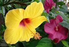 朱槿,锦葵科木槿属的常绿灌木,叶子呈阔卵形或狭卵形,边缘具粗齿;花生于上部叶腋间,常下垂,花冠呈漏斗形且为玫瑰红色或淡红、淡黄等色,花瓣呈倒卵形,先端圆;蒴果为卵形,平滑无毛且有喙;花期全年。它的名称,…全部>>
