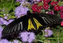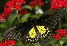 金裳凤蝶是凤蝶科、裳凤蝶属的动物。金裳凤蝶身体呈黑色,头、颈和胸侧有红毛,腹部有黑黄两色相间条纹,雄蝶前翅黑色,具黑天鹅绒光泽,各脉两侧灰白色,后翅金黄色,各室外缘有等腰三角形黑斑1枚,斑内侧有晕,…全部>>