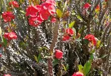 虎刺梅:别称铁海棠,是蔓生灌木植物。茎多分枝,长60-100厘米,直径5-10毫米,具纵棱,密生硬而尖的锥状刺,刺长1-1.5厘米,直径0.5-1.0 毫米,常呈3-5列排列于棱脊上,呈旋转。叶互生…全部>>
