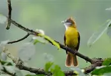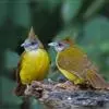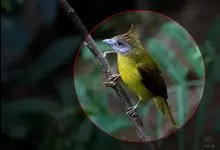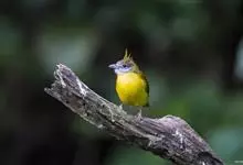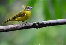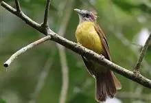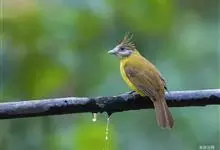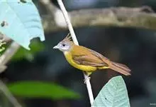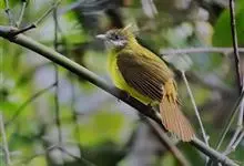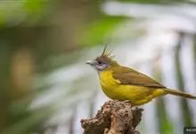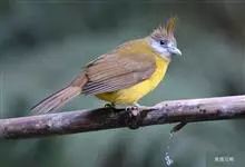 黄腹冠鹎:体长19-24厘米,是一种体型略大的褐色鹎。头顶橄榄褐色具黑褐色羽冠。白色的喉膨起,下体黄色。似白喉冠鹎但较鲜亮,上体褐色较重,腹部为鲜亮的柠檬黄色。虹膜褐色;嘴黑色;脚粉红色。…全部>>