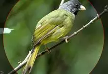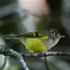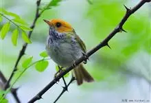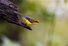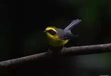 黑脸鹟莺:体长10厘米,是有特色的体小而多彩的莺鸟。粗眉纹,颏、喉及尾下覆羽黄色,脸罩黑,头顶及颈背灰色,上体绿,无翼纹,腹白。虹膜褐色;上嘴色深,下嘴肉色;脚偏绿色。…全部>>