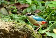 蓝翅八色鸫是雀形目八色鸫科的鸟类。体长17-20厘米,体重类约48-70克,体型圆胖,尾短,腿长,以身体具有红、绿、蓝、白、黑、黄、褐、栗等鲜艳夺目,丰富艳丽的色彩而得名,是很有观赏价值的鸟类。主要…全部>>