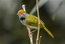 黑喉缝叶莺:体长11.5厘米,是一种小型的顶冠棕色、腹部白色的莺。尾甚长而常上翘,臀黄色,具特征性的偏黑色喉,上体橄榄绿色,头侧灰色。雌鸟色暗,头少红色且喉少黑色。与长尾缝叶莺的区别在后顶冠亦为棕色,…全部>>