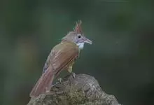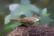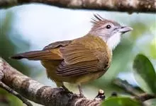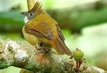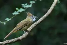 白喉冠鹎:体长20-25厘米。头顶红褐色,有长而细的羽冠、红褐色,头侧灰色。上体橄榄绿黄色,飞羽暗褐色,外翈茶黄色,尾下覆羽皮黄色。…全部>>