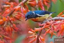 黄腹啄花鸟:体重11-16克,体长104-117毫米。是一种体型大,下腹部为艳黄色的啄花鸟,雄鸟特征为头黑色,喉部有白色纵斑、喉侧及上体成对比,两翅和尾黑色,外侧尾羽内翈具白色斑块。其余下体淡黄色。…全部>>