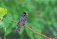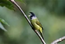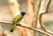 黑头鹎:体长17厘米。是一种中等体型的偏黄色鹎。特征为头辉黑、喉黑而眼蓝。上体黄橄榄色;两翼及尾偏黑,具明显的黄色尾端;下体绿黄色。另一罕见色型为灰色,尾缘白色。与黑冠黄鹎的区别在无羽冠且尾端黄色。…全部>>