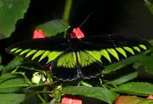 荧光裳凤蝶是凤蝶科裳凤蝶属的一种大型蝴蝶,该物种共有3个亚种。该蝶飞翔的时候姿态优美,前翅黑色,后翅金黄色和黑色交融的斑纹在阳光照射下金光灿灿,显得华贵美丽。幼虫寄主为多种马兜铃属的植物,取食马兜铃…全部>>